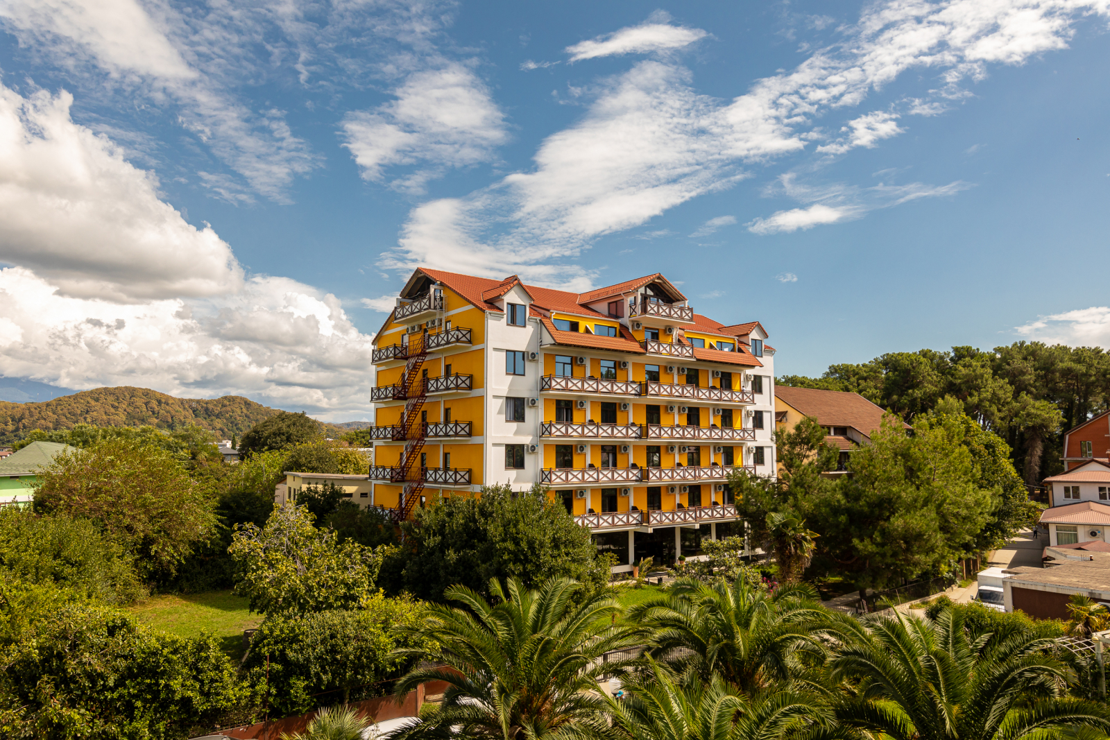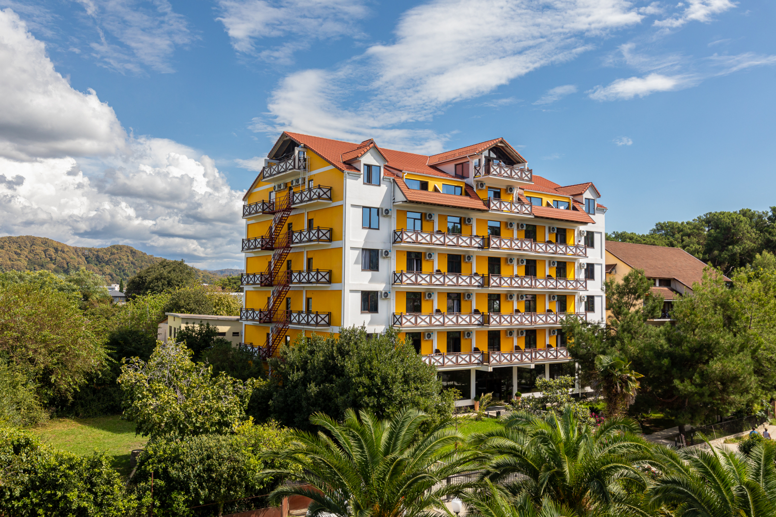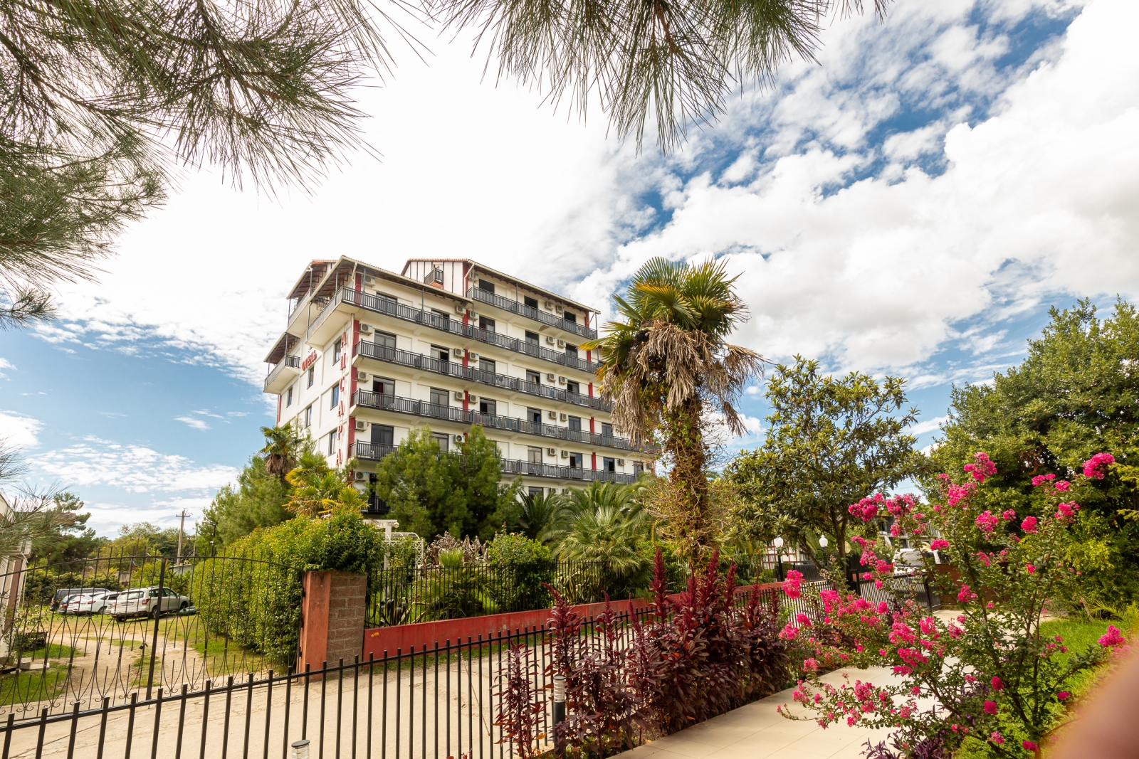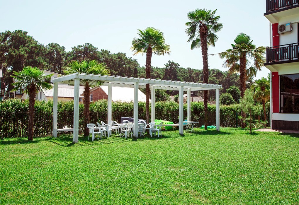 Здесь есть 4 корпуса, которые имеют 2, 4, 6 и 7 этажей. Самое высокое здание находится рядом с Пицундской бухтой в окружении леса. Чистый воздух и живописная природа. Территория ограждена от чужих глаз. Для отдыха есть беседки и площадки.