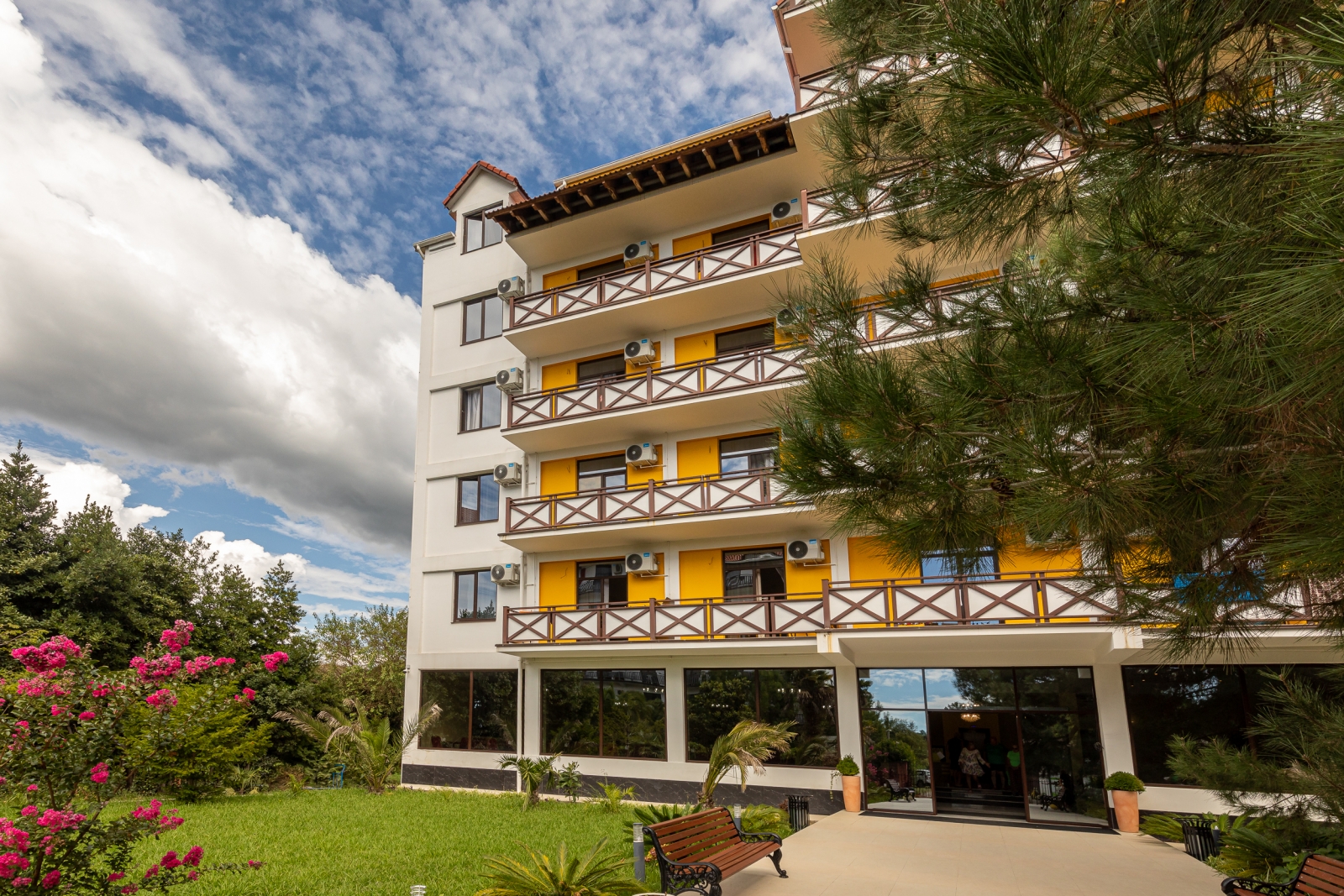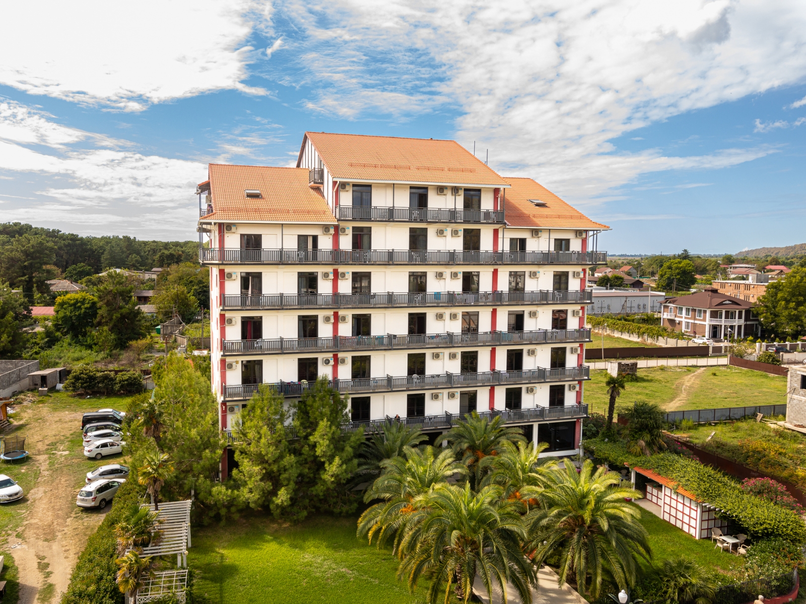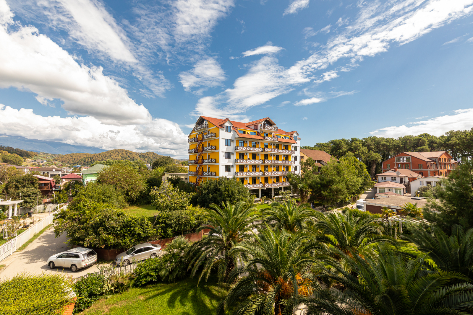 Здесь есть 4 корпуса, которые имеют 2, 4, 6 и 7 этажей. Самое высокое здание находится рядом с Пицундской бухтой в окружении леса. Чистый воздух и живописная природа. Территория ограждена от чужих глаз. Для отдыха есть беседки и площадки.