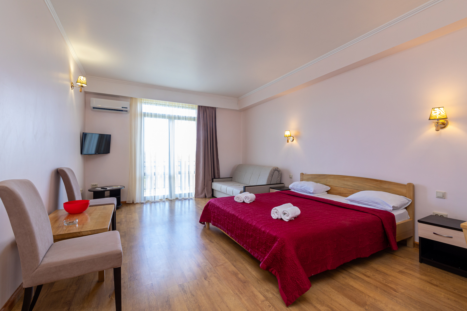 Расслабиться можно в комфортных номерах, которые оснащены всем необходимым. Оформление выполнено в классическом стиле в светлых тонах. Основной прием пищи происходит в столовой, где подают блюда различных кухонь: кавказская, русская и европейская. Гостям предлагают на выбор завтрак или 3-разовое питание, а также заказ по меню.
