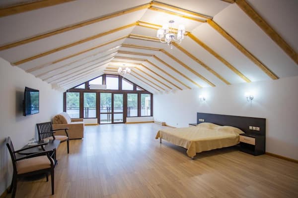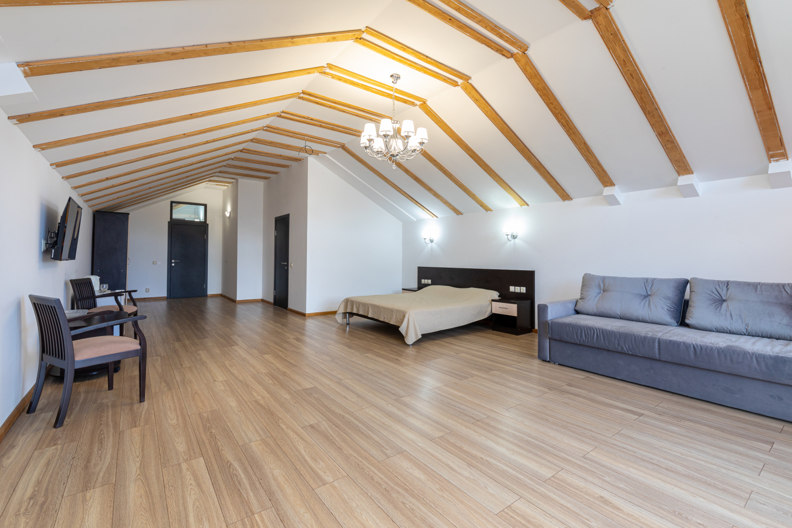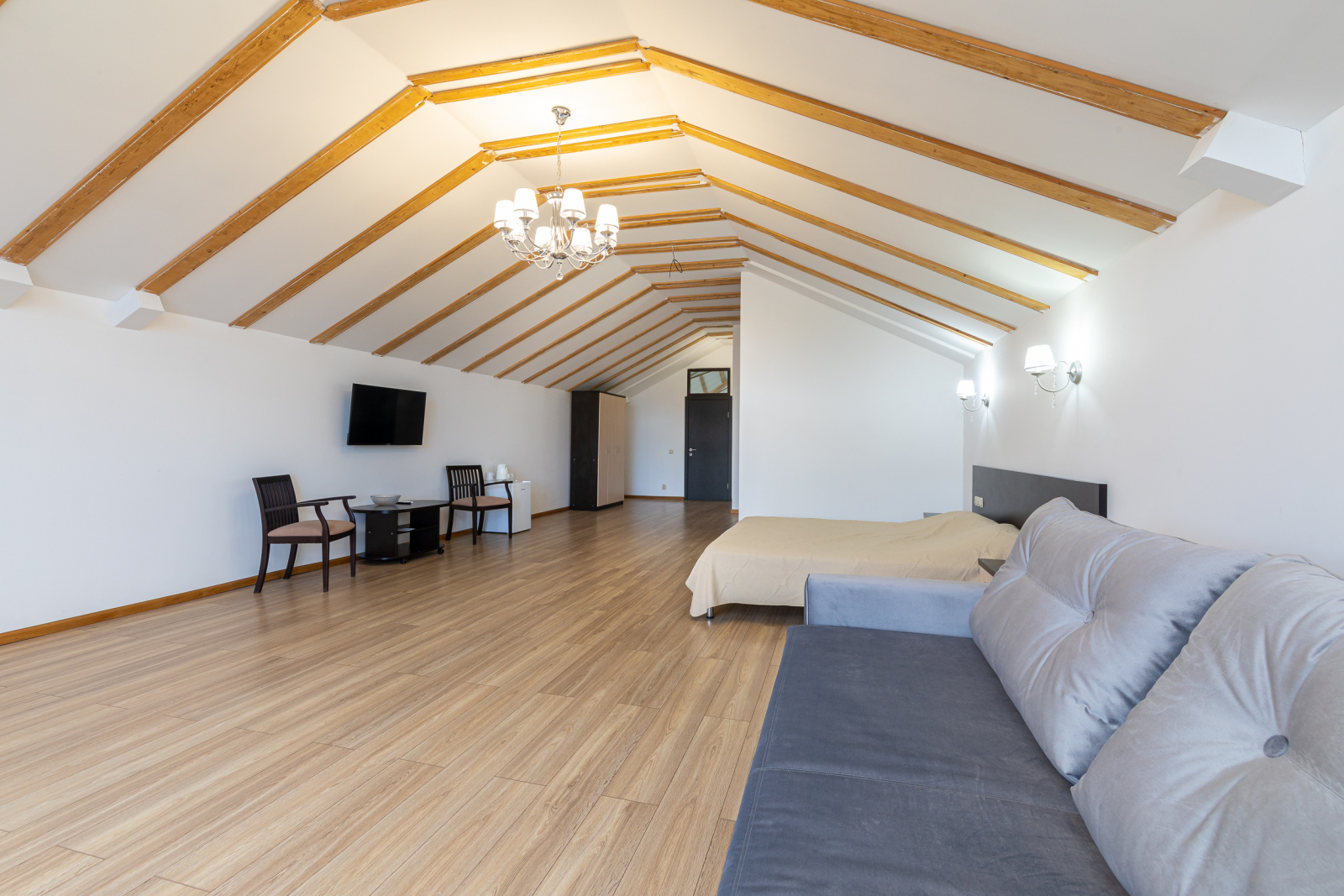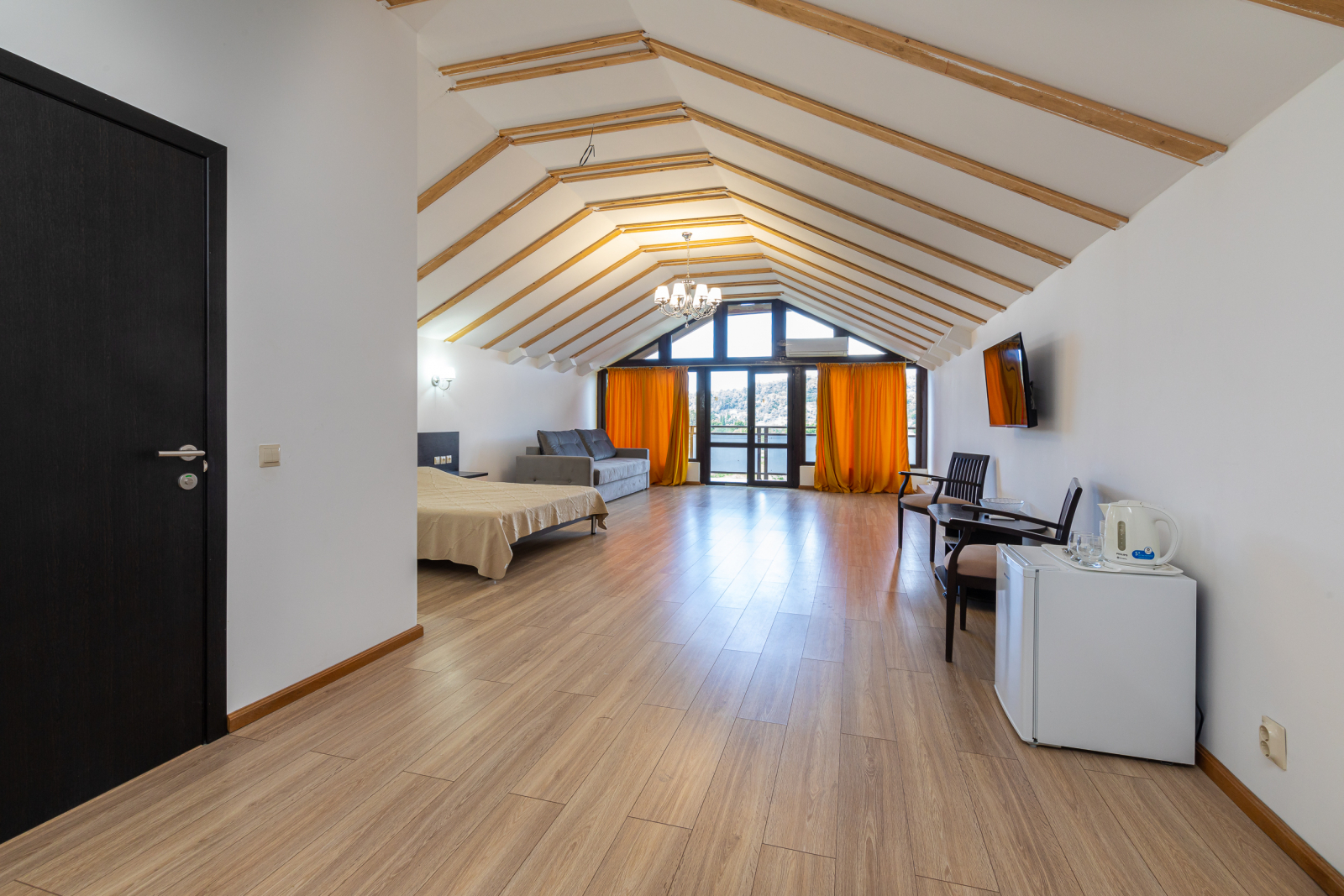 Площадь номера - 55 кв.м. 2 осн. места. 2 доп. места. Балкон. Мебель: вешалка, диван раскладной, зеркало, кровати односпальные /одна двуспальная кровать, прикроватные тумбочки, стол, столик журнальный, стулья, шкаф. Оборудование: кондиционер, телевизор, холодильник. Санузел: с ванной, туалетные принадлежности, фен. Сервис: смена полотенец, смена постельного белья, уборка номера.