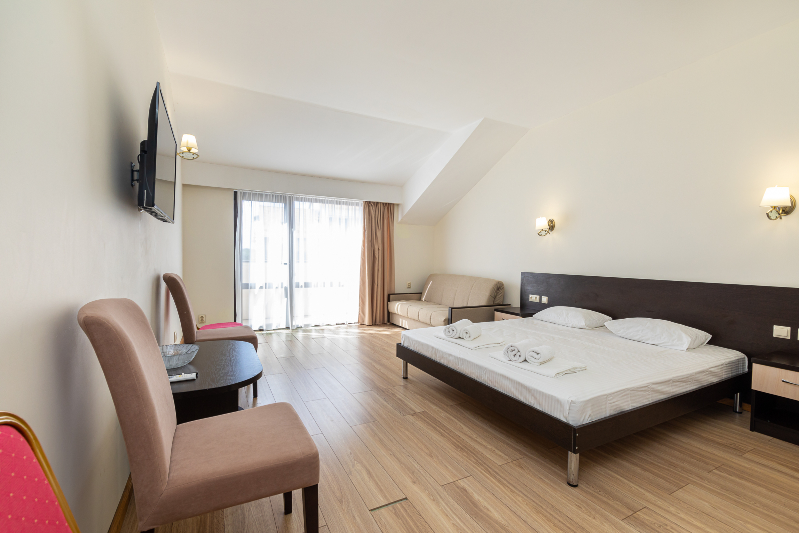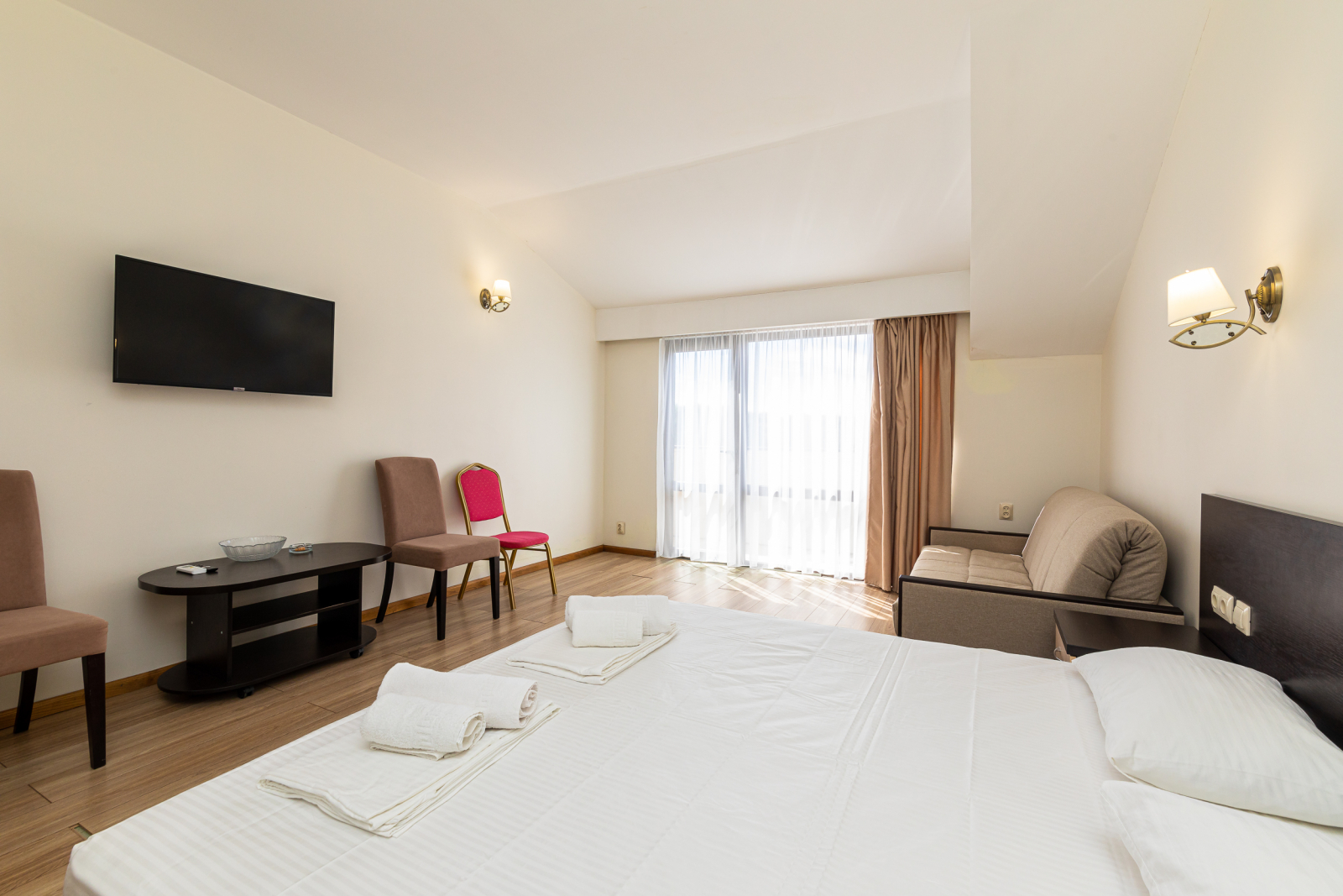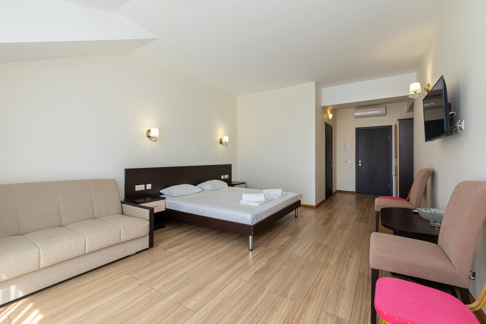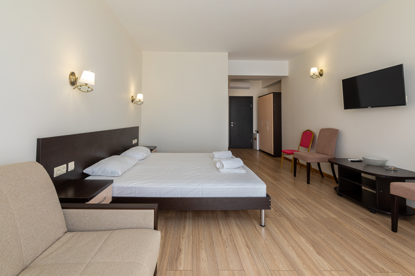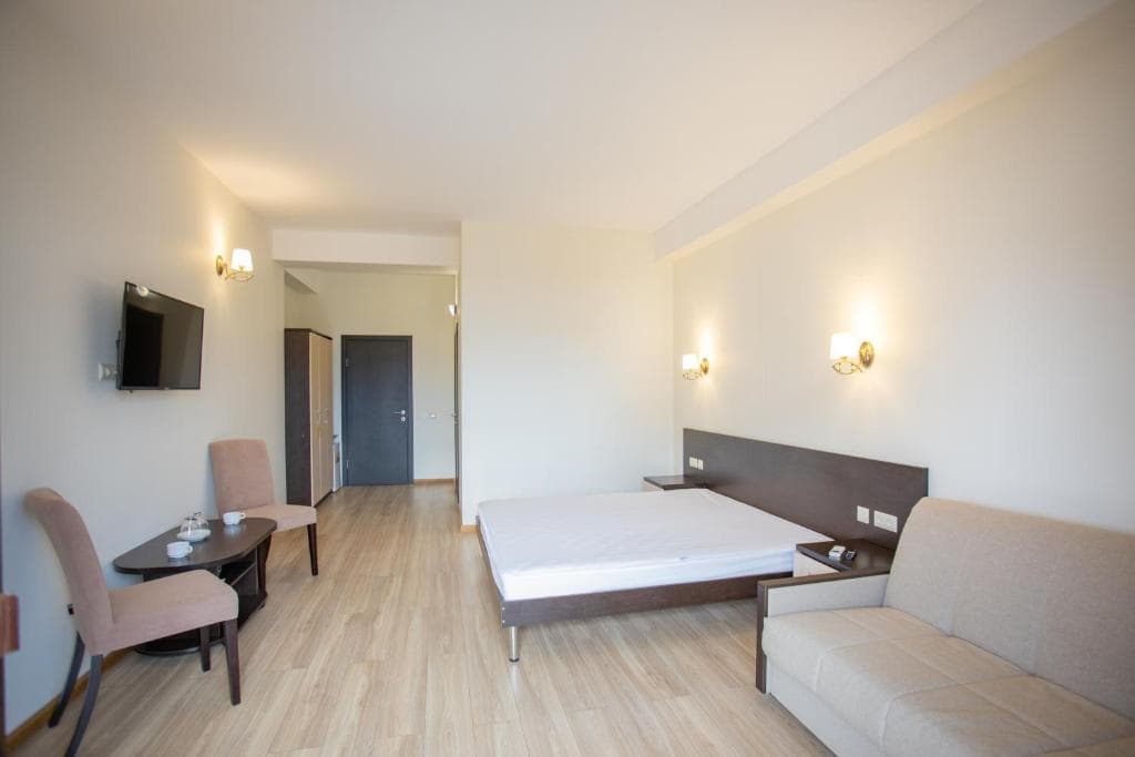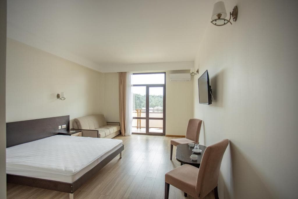 Площадь номера - 33 кв.м. 2 осн. места. 2 доп. места. Балкон. Мебель: вешалка, диван раскладной, зеркало, кровати односпальные /одна двуспальная кровать, прикроватные тумбочки, стол (не во всех номерах), стулья, шкаф. Оборудование: кондиционер, телевизор, холодильник. Санузел: с ванной, туалетные принадлежности, фен. Сервис: смена полотенец, смена постельного белья, уборка номера.